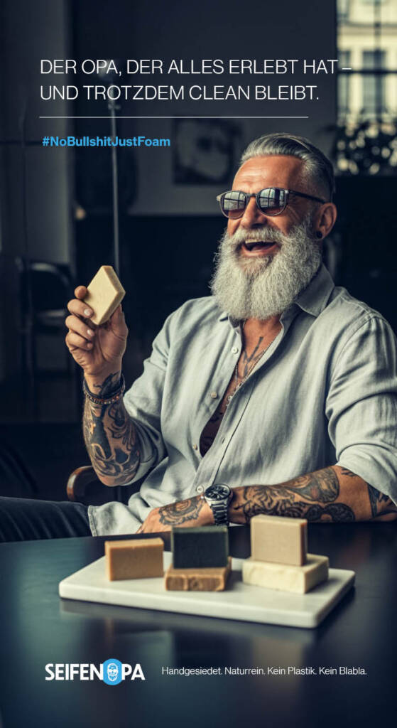 Der entwickelte Markenauftritt setzt auf klare Typografie, natürliche Materialien und eine humorvolle, selbstbewusste Tonalität, die Seifenopa als eigenständige, wiedererkennbare Marke positioniert.